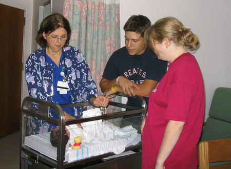 The nurse teaching Eric how to swaddle the baby |